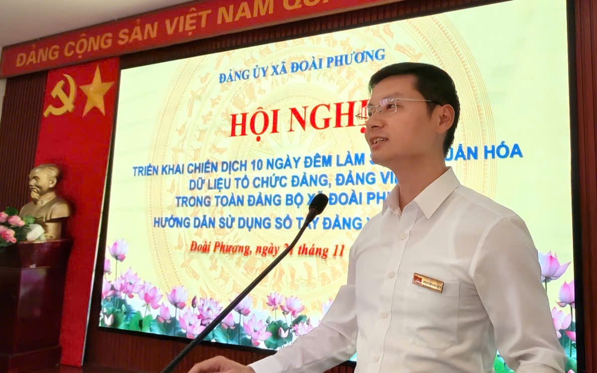 Thực hiện Kế hoạch số 04 – KH/TU ngày 18/11/2025 của Thành ủy Hà Nội về "Chiến dịch 10 ngày đêm làm sạch, chuẩn hóa dữ liệu tổ chức đảng, đảng viên, cán bộ lãnh đạo quản lý trong hệ thống chính trị trên cơ sở dữ liệu đảng viên toàn Đảng bộ thành phố Hà Nội". Chiều 21/11, Đảng ủy xã Đoài Phương tổ chức hội nghị triển khai chiến dịch 10 ngày đêm làm sạch dữ liệu đảng viên và hướng dẫn sử dụng ứng dụng Sổ tay đảng viên điện tử cho 150 đại biểu là Bí thư, Phó Bí thư chi bộ, thành viên tổ chuyển đổi số của 30 thôn trên địa bàn. Đồng chí Trần Phạm Hùng – Phó Bí thư TT Đảng ủy xã tới dự.