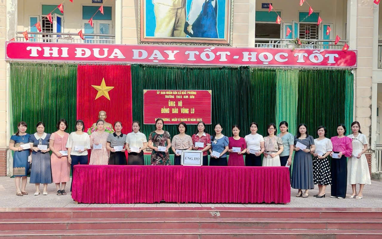 Ngày 14/10/2025, đại diện Ban Giám hiệu Trường THCS Kim Sơn, các thầy cô giáo cùng đại diện cha mẹ học sinh đã trực tiếp đến Trường THCS Kha Sơn, xã Phú Bình, tỉnh Thái Nguyên – đơn vị chịu nhiều thiệt hại do cơn bão số 11 gây ra, trao những món quà ấm áp nghĩa tình gồm: Vở viết: 2310 quyển; sách giáo khoa THCS: 1040 cuốn; Bút viết: 640 chiếc; Ba lô: 11 chiếc; Sách giáo khoa tiểu học: 330 cuốn; Sách giáo khoa THPT: 120 cuốn cùng nhiều đồ dùng học tập khác. Ngoài ra, toàn thể cán bộ, giáo viên, nhân viên Trường THCS Kim Sơn đã quyên góp được 13.148.000 đồng. Toàn bộ số tiền này sẽ được chuyển về Ủy ban Mặt trận Tổ quốc xã Đoài Phương để gửi đến đồng bào vùng lũ thông qua Mặt trận Tổ quốc Việt Nam.